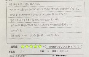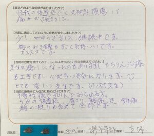 また治療後に本日のまとめを動画で送ってくださったおかげで、生活で気を付ける点など確認することが出来て助かりました。