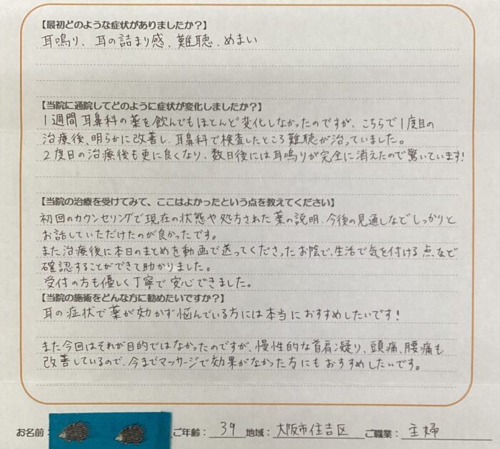 1週間耳鼻科の薬を飲んでもほとんど変化しなかったのですが、こちらで1度目の治療後、明らかに改善し、耳鼻科で検査したところ難聴が治っていました。