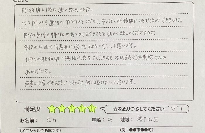 不妊治療を始め、なかなか授かる事が出来ずに半年が過ぎた頃、このまま病院で同じように治療を続けるだけでなく、体質改善も一緒にしたいと思いこちらのゆとり鍼灸院さんに通い始めました。